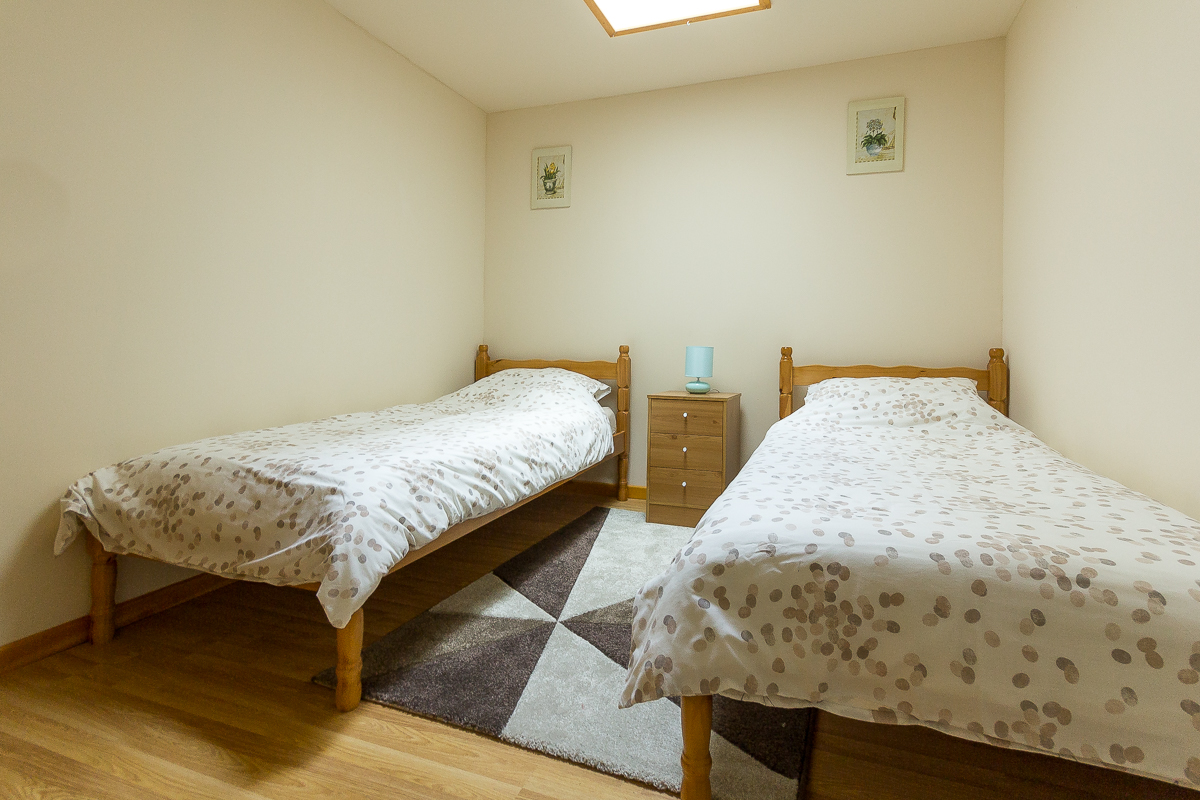 Twin 3 foot beds, chest of drawer, bedside lamps, built-in wardrobe, Velux window, (approx size of room 13ft x 10ft). Laminate flooring throughout with bedside rugs.