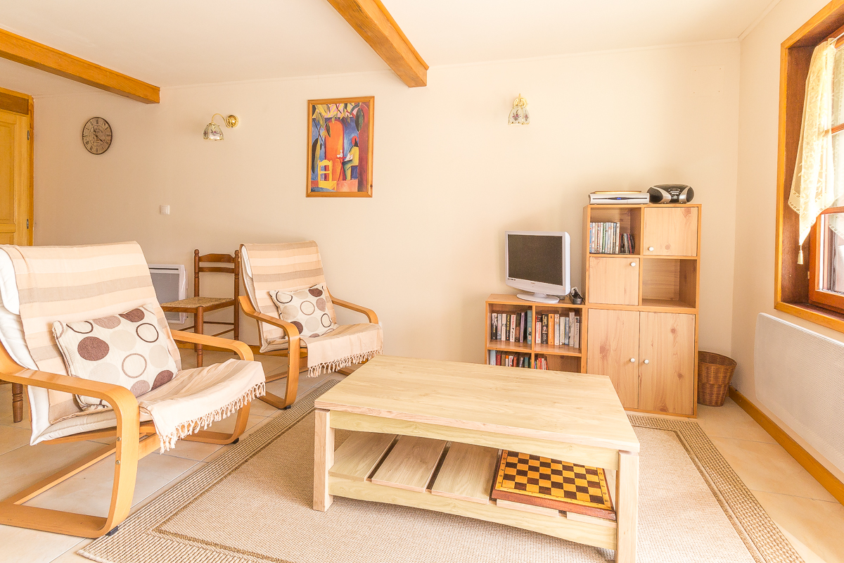 There is a sitting area with large comfortable double sofa bed, easy chairs, TV/DVD player and radio/CD player. The living space is open plan with sofa bed, armchairs and coffee table.