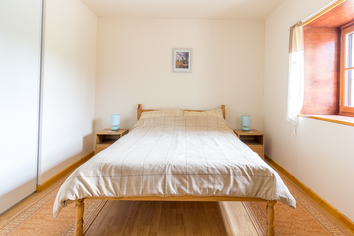 Large room (approx size of room 19ft x 10ft) with double bed, bedside chests with lamps, full length mirror, built-in wardrobe, easy chair and table. Space for a folding cot (also available upon request). Hairdryer supplied. Laminate flooring throughout with bedside rugs. Window has sliding fly screen. All beds supplied with duvets and ample pillows, bed linen included, house towels (1 bath 1 hand ) also included, beds made up for your arrival : bottom sheets only for cot.